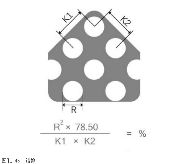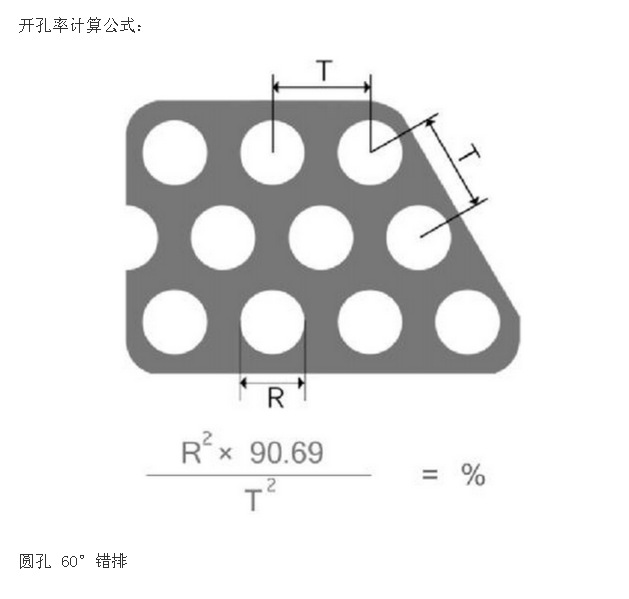 圆孔, 外形尺寸1M X 2M.;2MM孔径, 4MM中心距, 60°错排,根据以上的信息及以下的公式,我们可以得出这种规格的冲孔网的开孔率为23%。也就是说冲掉的孔的面积之和为0.465平方米(1M X 2M X 23%)